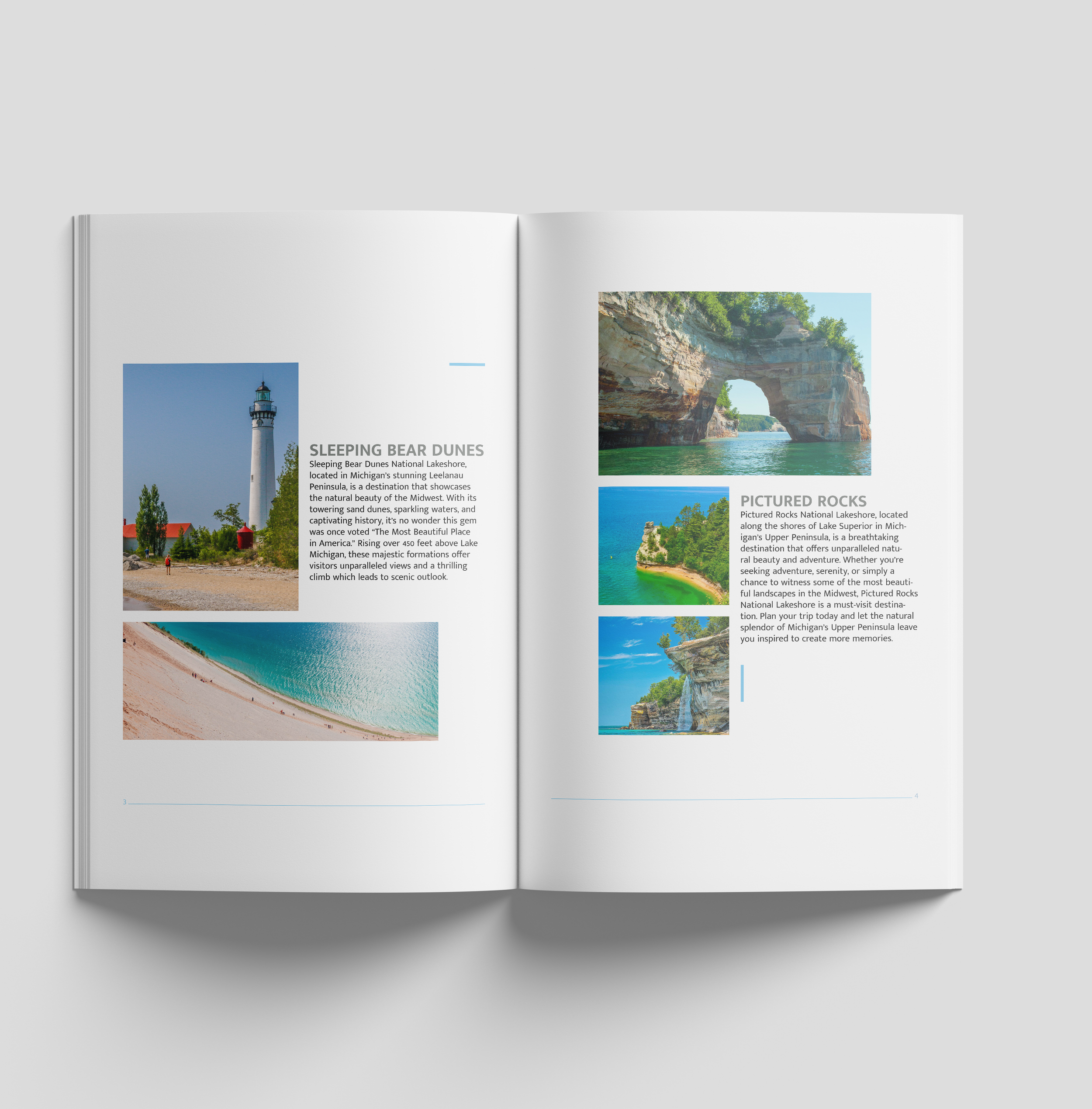 Discover Michigan is an editorial piece I created for my creative media class, using only indesign, focusing mainly on the importance of type and grid.