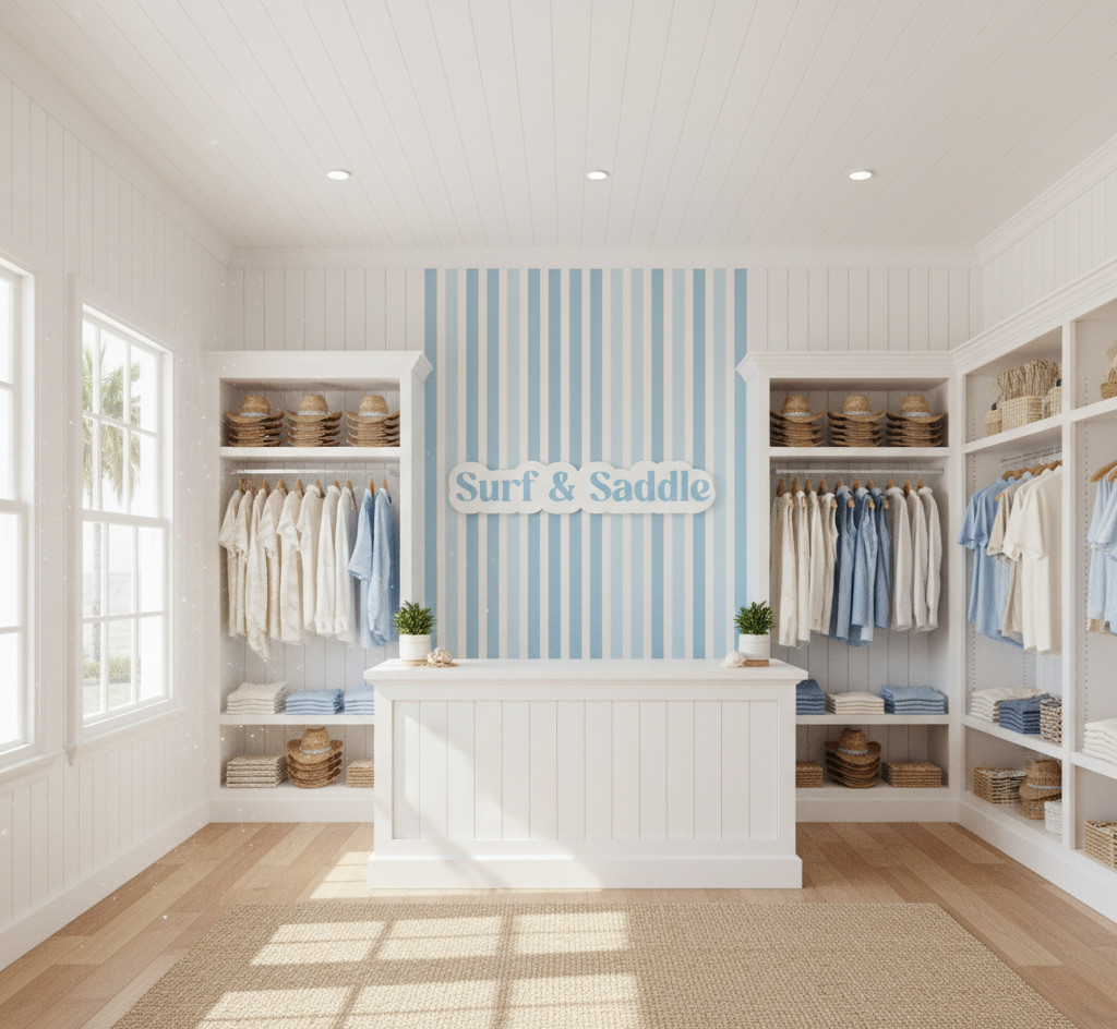 The Surf & Saddle store is designed to feel like you’re stepping into a coastal escape with a southern soul. The atmosphere blends cozy beach house comfort with a warm, rustic western twist. Our website allows visitors to browse and purchase our unique apparel right from home, discovering pieces that blend easygoing surf style with western-inspired details.