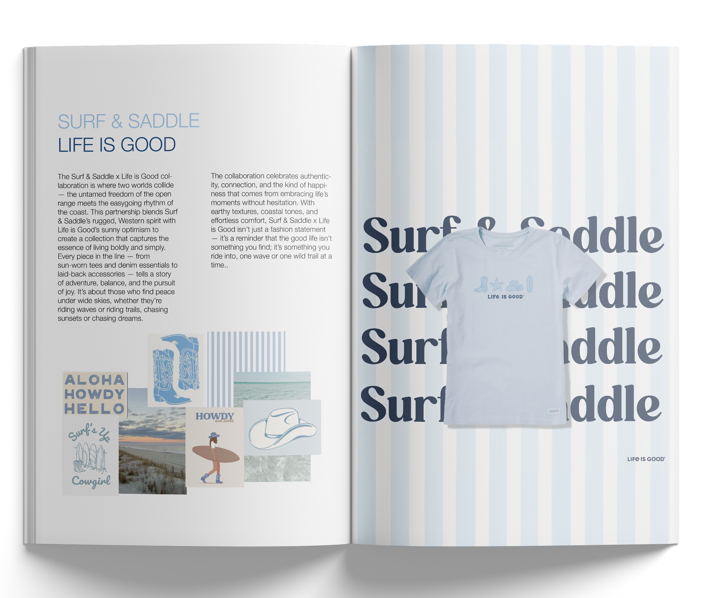 The Surf & Saddle x Life is Good collaboration celebrates the simple joys of sunshine, adventure, and a laid-back lifestyle. This limited collection blends Surf & Saddle’s coastal-southern aesthetic with Life is Good’s optimistic, feel-good energy, creating apparel that’s as comfortable as it is full of character
